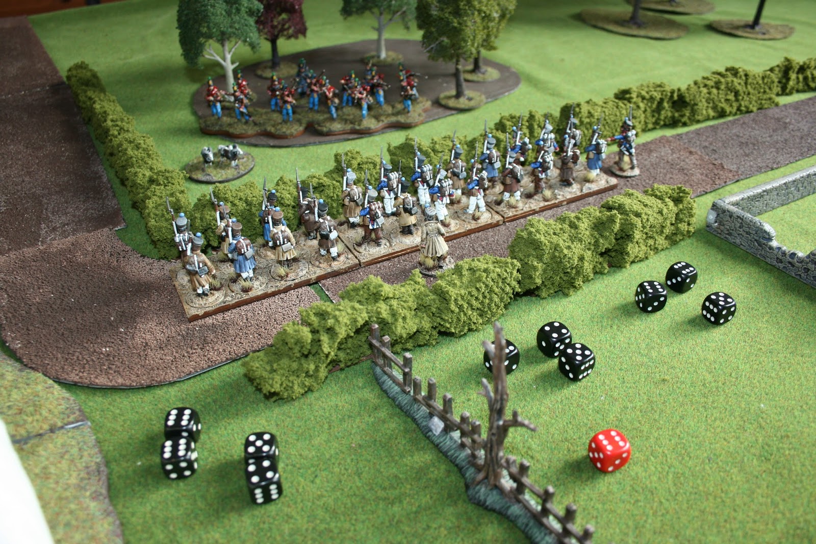 Below, Volte-Face's Fusiliers leap (vault?) over one hedge and line up along the road, taking some cover behind another hedge. Captain Cliche's troops fan out into line, preparing to surprise some innocent-looking sheep in the walled field. The quick march has fatigued Cliche's soldiers and this ended up having a bearing on the battle's outcome.